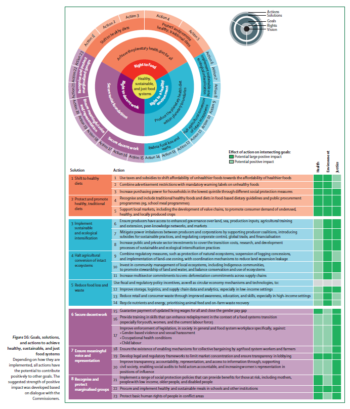 Die Kommission betont, dass ein gerechtes Ernährungssystem eines ist, in dem die Menschenrechte auf Essen, eine gesunde Umwelt und menschenwürdige Arbeit erfüllt sind. Sie hat neun Bedingungen (sog. soziale Grundlagen) festgelegt, die es ermöglichen, dass diese grundlegenden Menschenrechte erfüllt werden können. Dazu gehören: Zugang zu bezahlbarer und gesunder Ernährung, eine gesunde Ernährungsumgebung, eine schadstofffreie Umwelt, ein stabiles Klima, existenzsichernde Löhne, wirksame Mitbestimmung, die Begrenzung wirtschaftlicher Marktmacht, bürgerliche und politische Freiheiten und keine Diskriminierung. Für jede soziale Grundlage wurden Indikatoren mit jeweiligen Schwellenwerten definiert, ab denen die soziale Grundlage als erfüllt gilt. Anschließend wurde geschätzt, wie viele Menschen weltweit unter dieser Schwelle liegen und welches Schadensausmaß das für die Verwirklichung der Menschenrechte hat. Die Zahlen sind ernüchternd: Schätzungsweise sind 2,3 Milliarden Menschen weltweit von Nahrungsmittelunsicherheit betroffen, 19,8 Millionen Neugeborene kommen mit zu niedrigem Geburtsgewicht zur Welt und 2,1 Milliarden Menschen haben keinen Zugang zu sauberem Trinkwasser.
